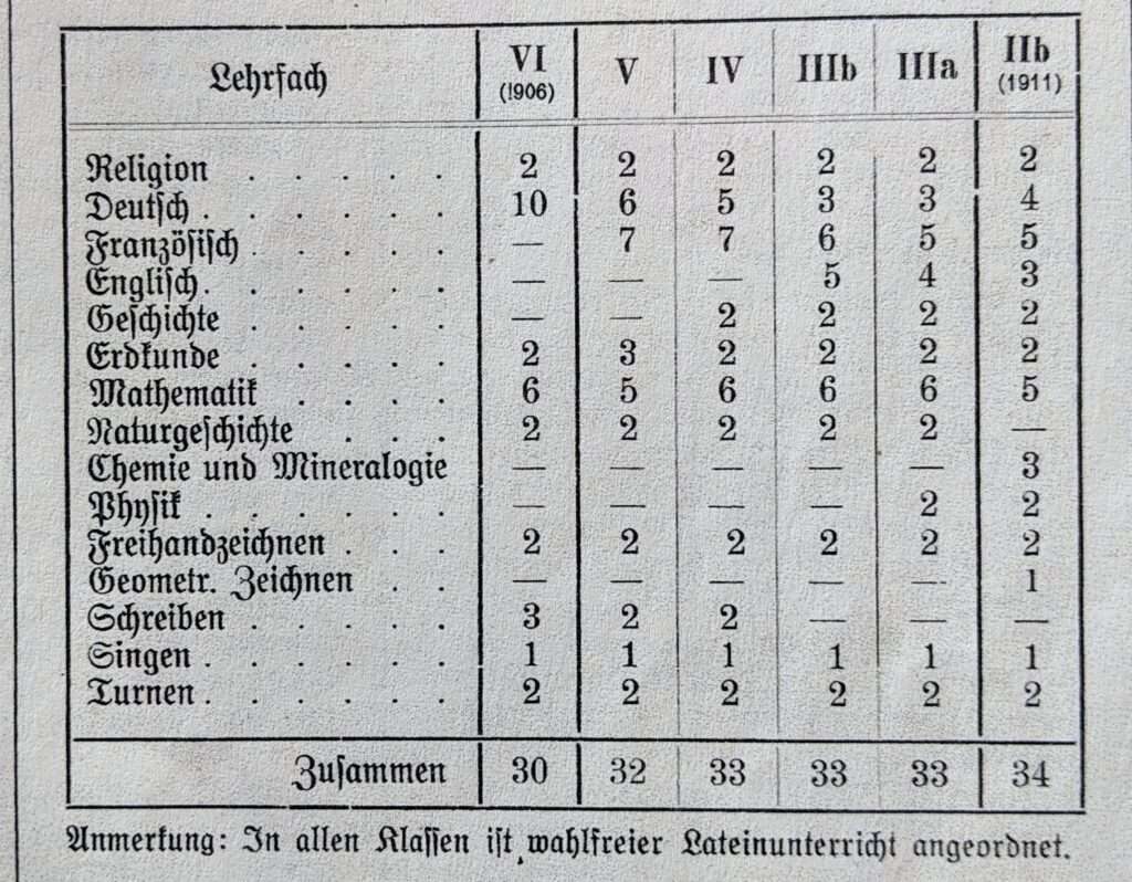 ↩︎ - Vgl. die Stundentafel in der Festschrift von 1911 (a. a. O.), S. 11.