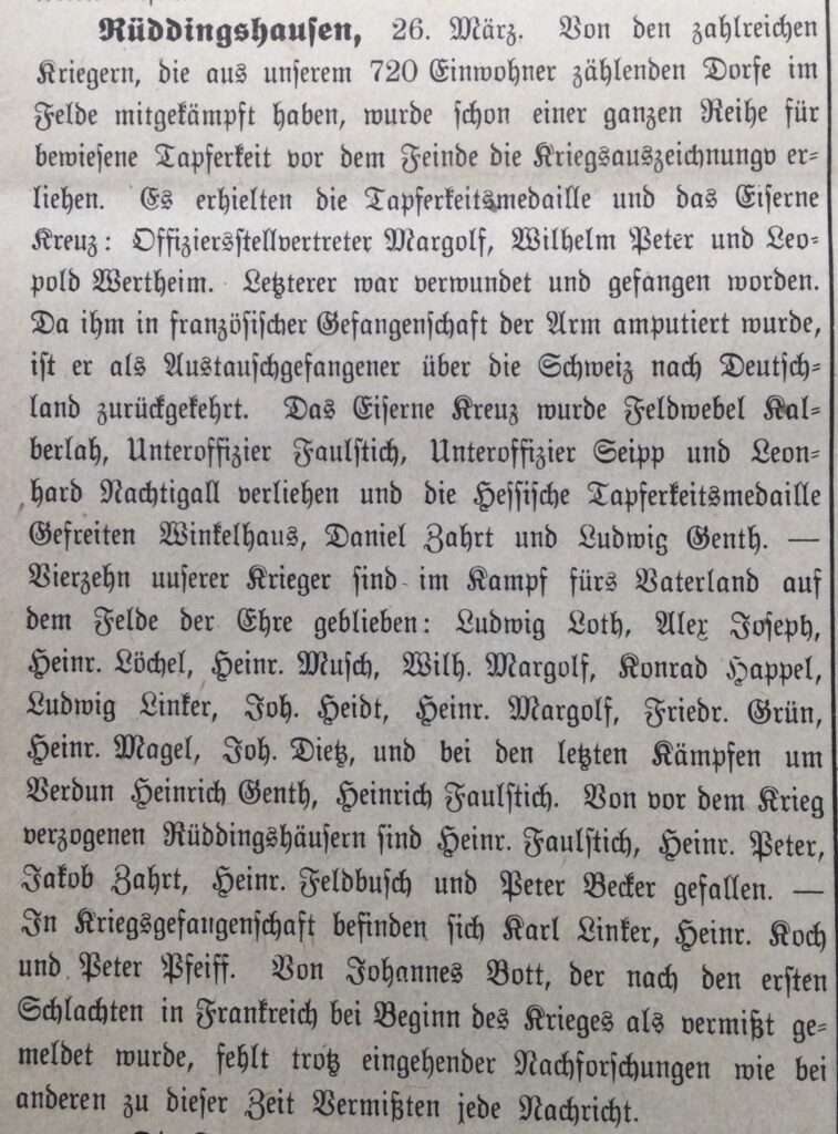 Zumindest in der Heimat scheint Leopold zunächst die erwartete Anerkennung erfahren zu haben. „Von den zahlreichen Kriegern,“ so schrieb ein Heimatreporter des Grünberger Anzeigers am 28. März 1916, „die aus unserem 720 Einwohnern zählenden Dorfe [sc. Rüddingshausen; Anm. d. Red.] im Felde mitgekämpft haben, wurde schon einer ganzen Reihe für bewiesene Tapferkeit vor dem Feinde die Kriegsauszeichnung verliehen. Es erhielten die Tapferkeitsmedaille und das Eiserne Kreuz: Offizierstellvertreter Margolf, Wilhelm Peter und Leopold Wertheim. Letzterer war verwundet und gefangen worden. Da ihm in französischer Gefangenschaft der Arm amputiert wurde, ist er als Austauschgefangener über die Schweiz nach Deutschland zurückgekehrt. […]“32