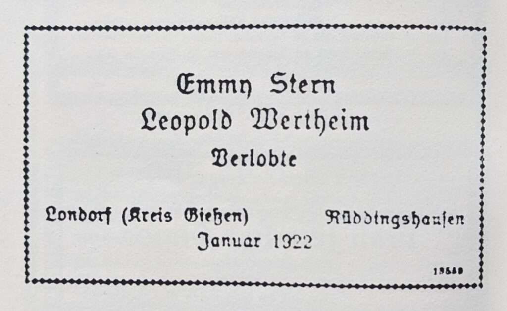 Am 31. Dezember 1921 gab Leopold Wertheim im Gießener Anzeiger seine Verlobung mit Emma Stern bekannt.41 Emma war am 9. September 1896 als Tochter des Viehhändlers David Stern und der Regina, geborene Blumenthal, in Londorf geboren worden. Sie hatte eine ältere Schwester Jenny, geboren am 21. Februar 1895; ihre jüngere Schwester Paula war am 1. Mai 1902 zur Welt gekommen.42 Sowohl Emmas Großvater mütterlicher- als auch ihr Großvater väterlicherseits waren bereits Viehhändler in Londorf gewesen.43